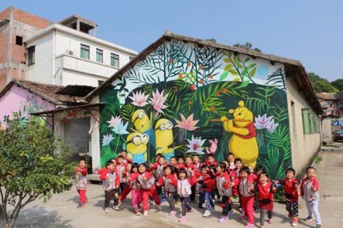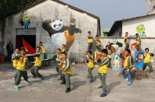 看着老墙上的耍功夫的熊猫,孩子们很欢喜。